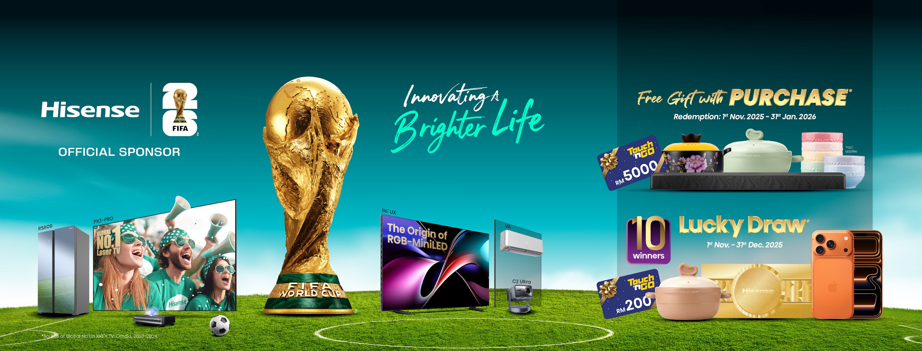 Shoppers who purchase selected Hisense products from authorized retail outlets during the campaign period will enjoy exclusive free gifts and rewards, including Touch ‘n Go eWallet credits worth up to RM5,000, Hisense Soundbars, and Color King cookware depending on the model purchased.